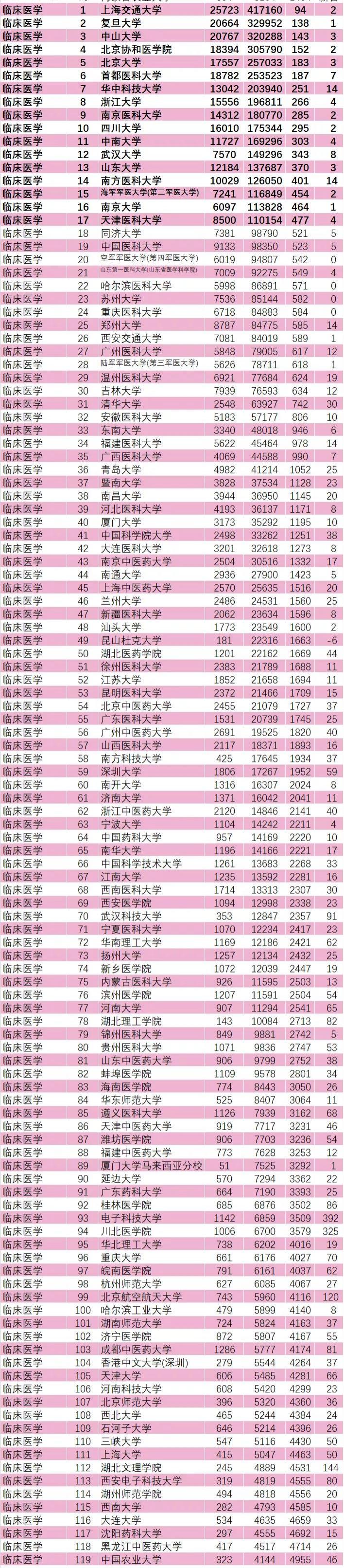 上海交通大学(第1名)、复旦大学(第2名)、中山大学(第3名)、北京协和医学院(第4名)、北京大学( 第5名)、首都医科大学(第6名)、华中科技大学(第7名)、浙江大学(第8名)、南京医科大学(第9名)、四川大学(第10名)。