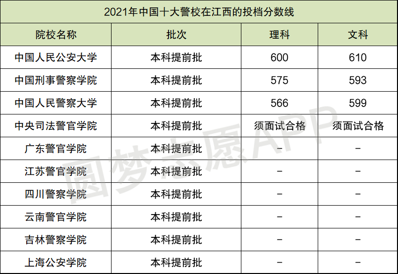 广东警官学院、江苏警官学院、四川警察学院、云南警官学院、吉林警察学院、上海公安学院都没有在江西招生,而中央司法警官学院须面试合格后才能投档,所以也没有投档分数;剩下三所院校在江西文理科收分最高的都是中国人民公安大学,文科投档线为610分,理科投档线为600分。