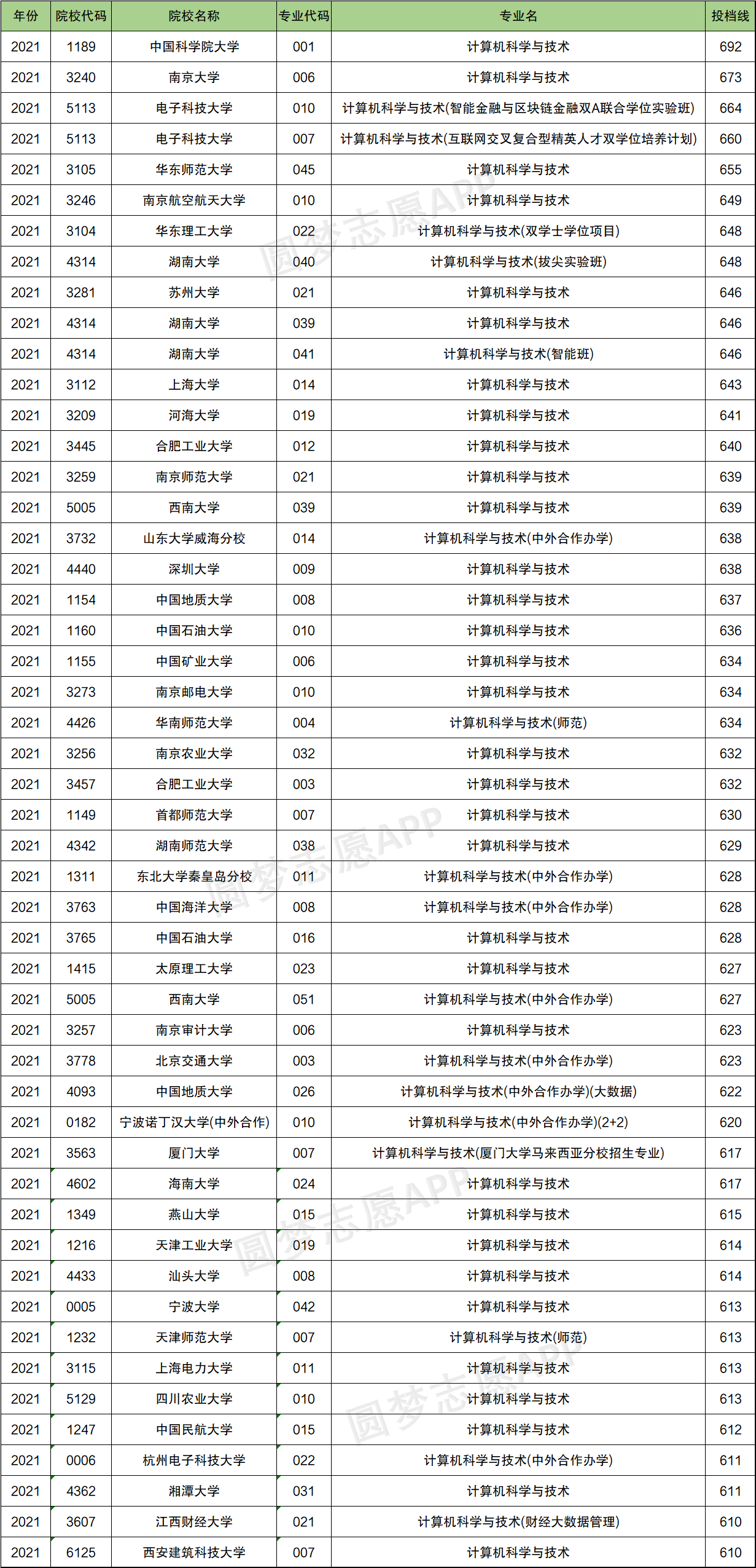 小编以各院校各专业2021年在浙江省的招录数据为例,整理出了计算机科学与技术专业投档分最高的50所大学名单,其中中国科学院大学投档分最高,达到了692分;其次是南京大学,为673分;第三名是电子科技大学,为664分。当然像清华北大这种一流大学,计算机类专业的投档分也很高,不过有的是在提前批招生,且有的是全部归类到了理科试验类,具体是多少分可以到官网进行查询。