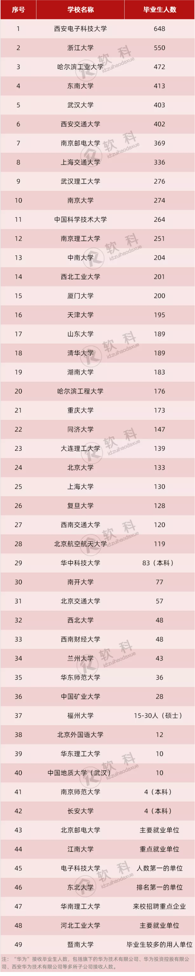 由于2021年的数据还未公布,因此小编为大家整理2020年公布的相关数据为例,共有49所高校在2020年就业质量报告中提及了“华为”是重点就业单位,其中42所高校给出了具体的人数,让我们一起来看看吧!