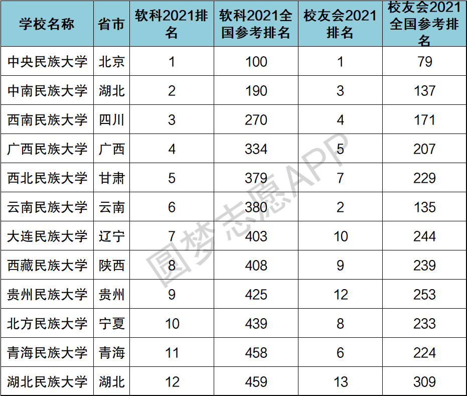 根据软科和校友会中国大学排行榜,以下为排名前十的民族大学名单及其排名: