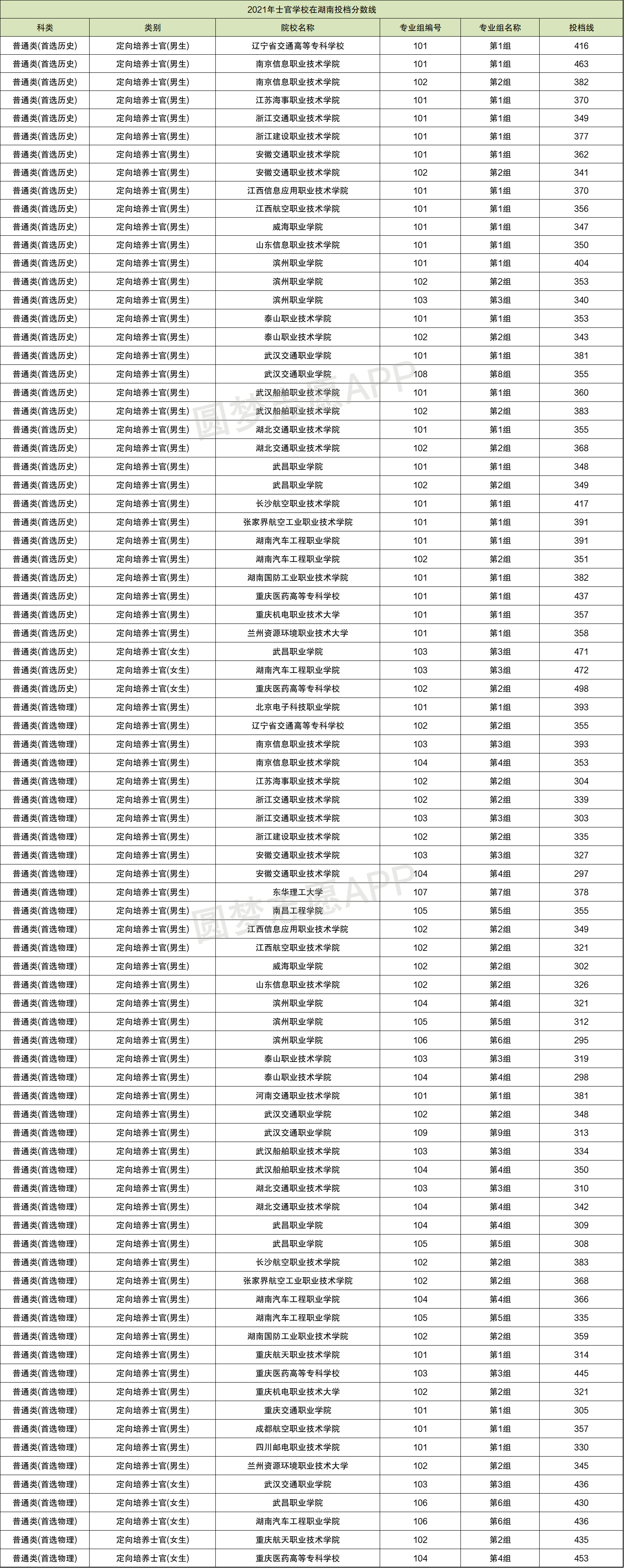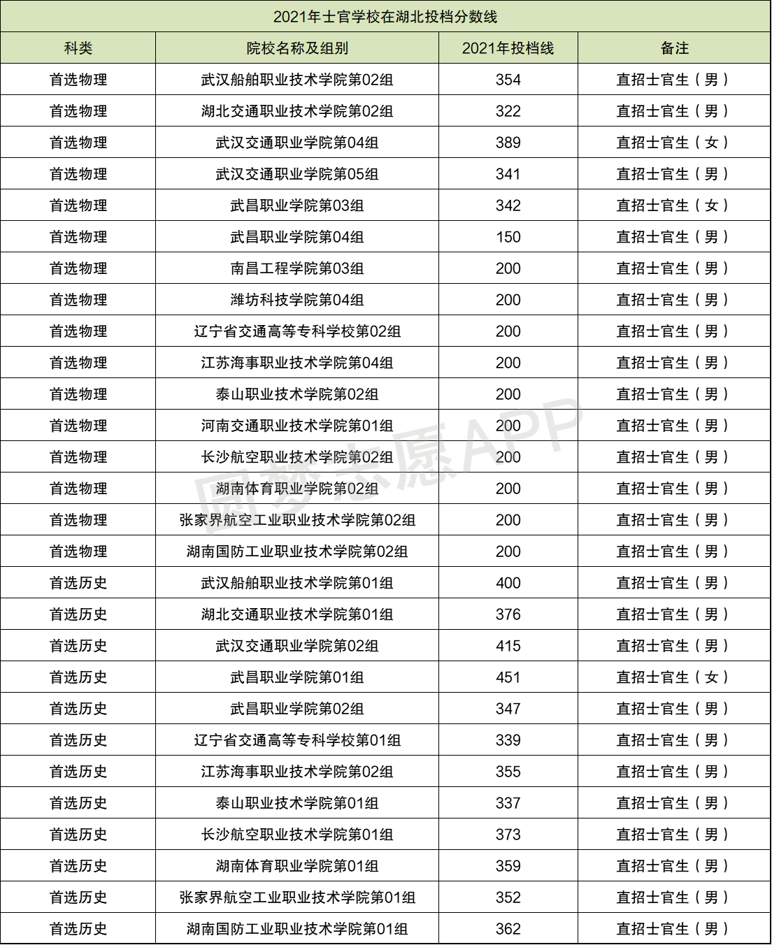 2021年士官学校在湖北历史科目组收分最高的是武昌职业学院第01组,2021年的投档线是451分,这个专业组招收的是女生;收分最低的是泰山职业技术学院第01组,2021年的投档线是337分,招收的是男生。