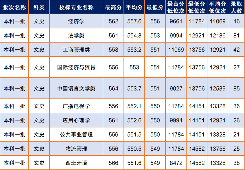 而学校在文科收分最低的专业为物流管理、西班牙语专业,其最低分均为549分,仅仅只超了一本线8分。