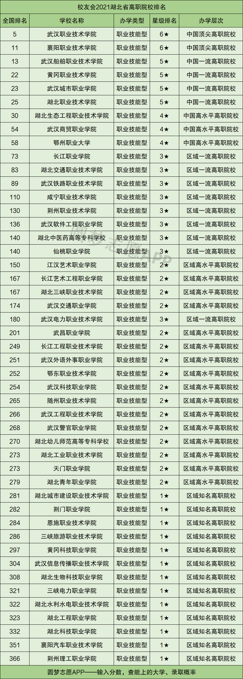 分数不够上本科的考生,可根据自己的情况,优先选择前10强的高职院校。2021湖北高职院校排名一览表如下:
