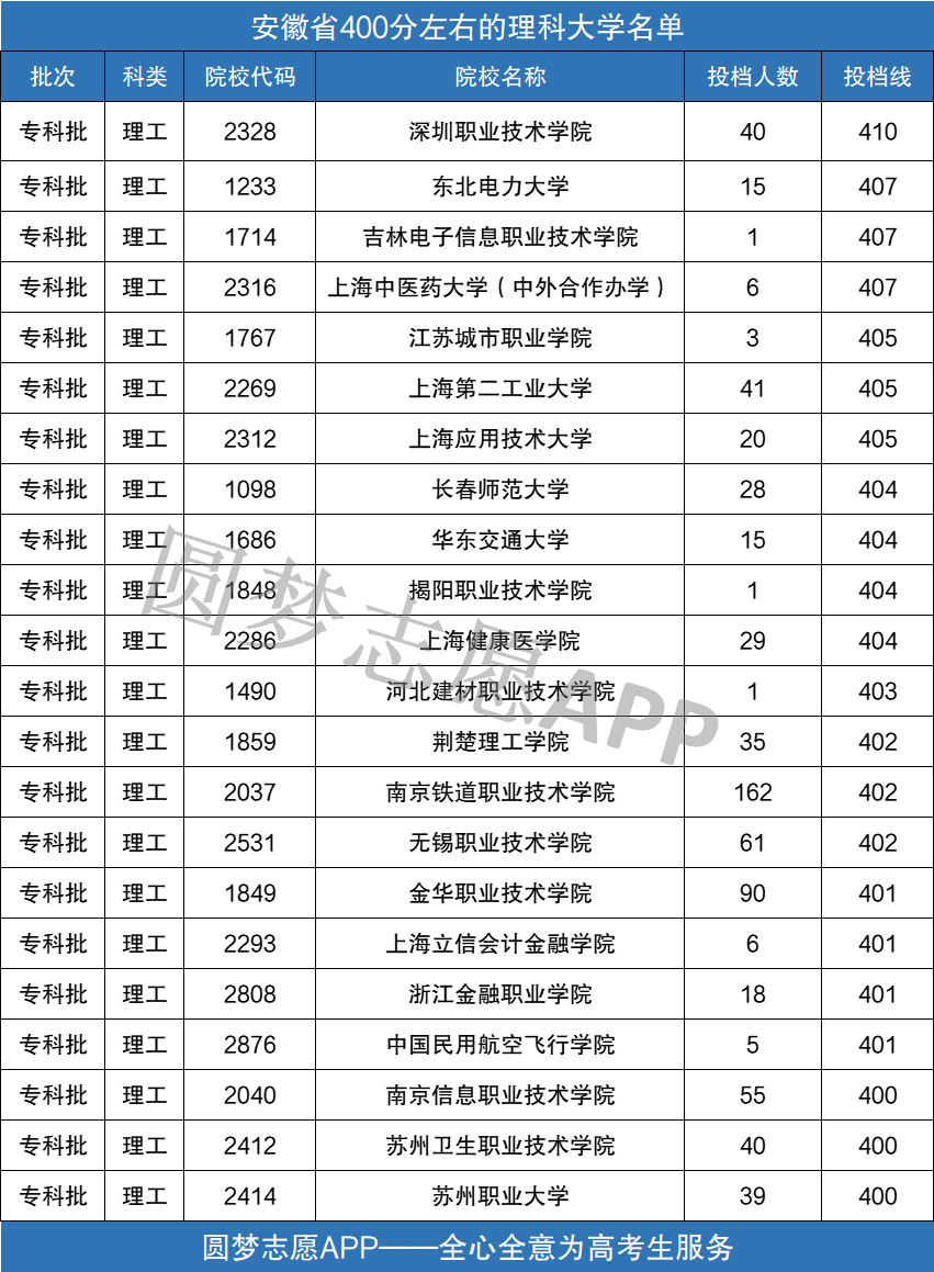 从安徽省400分左右的理科大学名单中,我们可以得知安徽省理科400分左右可上的院校一共有22所,且都在专科批进行招生录取,也就是说,如果安徽考生分数在400分左右能够选择的院校只有专科院校。以下是部分收分较高的理科大学名单: