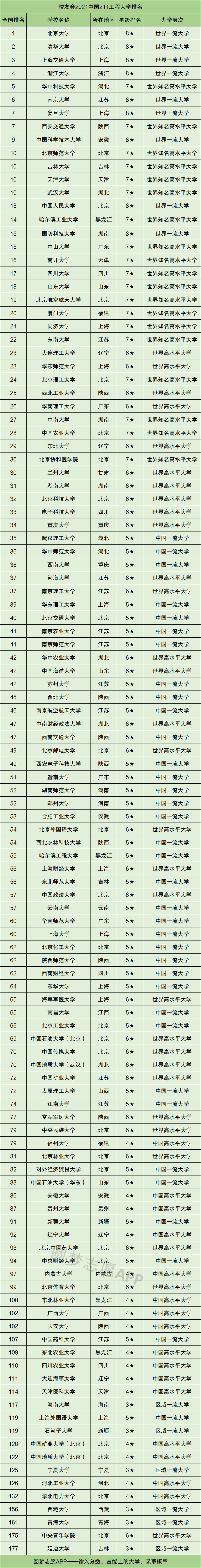 当然除了校友会排名之外,还有软科、武书连、金平果排名等各大排名网站,只是每个排名网站排名指标都会有所不同,所对应的211大学排名也会有所偏差,而本文选取的是校友会排名,是因为同学们对校友会排名认可度较高。如果同学们想要了解其它网站排名可以在手机应用市场“”查询了解。
