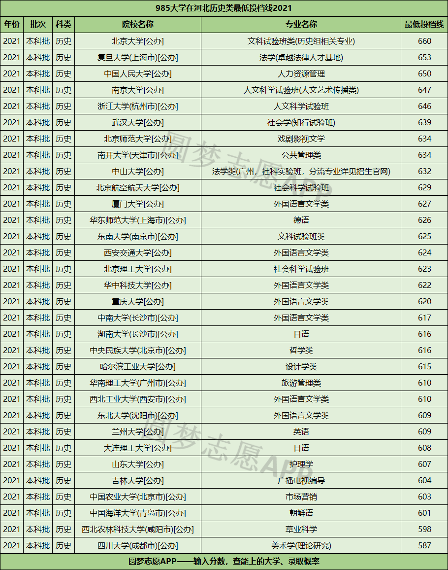 下面是全国985大学录取分数线表-985大学各专业录取分数线2021(河北省):