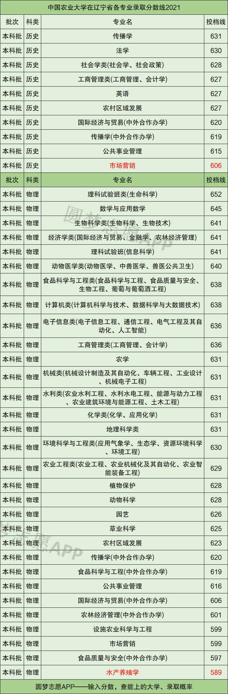 2021年中国农业大学在辽宁省本科批次历史类录取分数线最低、最好考的专业是市场营销,投档最低分为606分;