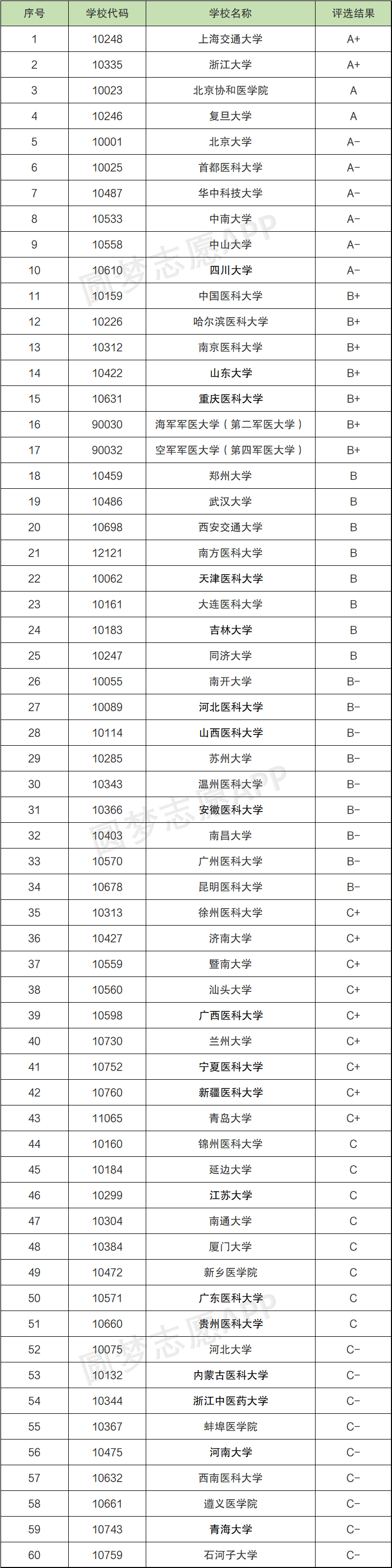 根据教育部第四轮学科评估来看,临床医学学科共有60所大学上榜,其中被评为A+的是上海交通大学和浙江大学,为全国第一的水平。此排名与上文中校友会的排名有差异,该榜单是针对临床医学这个学科大类,下面还包含到多个二级学科,所以学习评估是评价的整个学科的实力水平,上文是具体到临床医学这个专业水平。