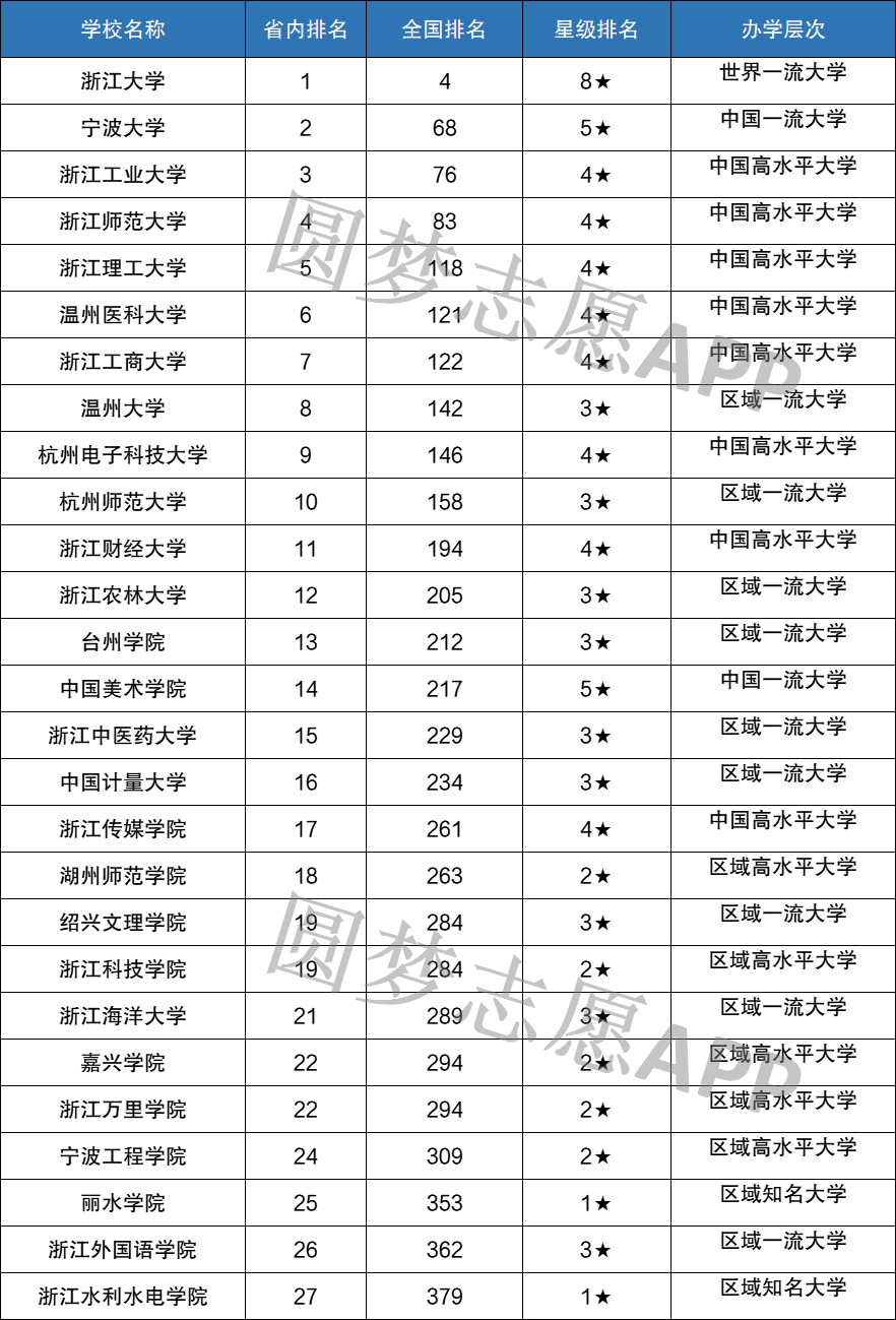 1、根据校友会2021年浙江省大学排名来看,浙江省排名前三的大学是浙江大学、宁波大学、浙江工业大学,排名前27所高校名单如下: