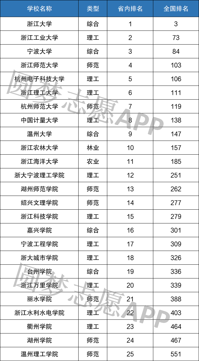 2、根据软科2021年浙江省大学排名来看,浙江省排名前三的大学是浙江大学、浙江工业大学、宁波大学,前27所高校名单如下: