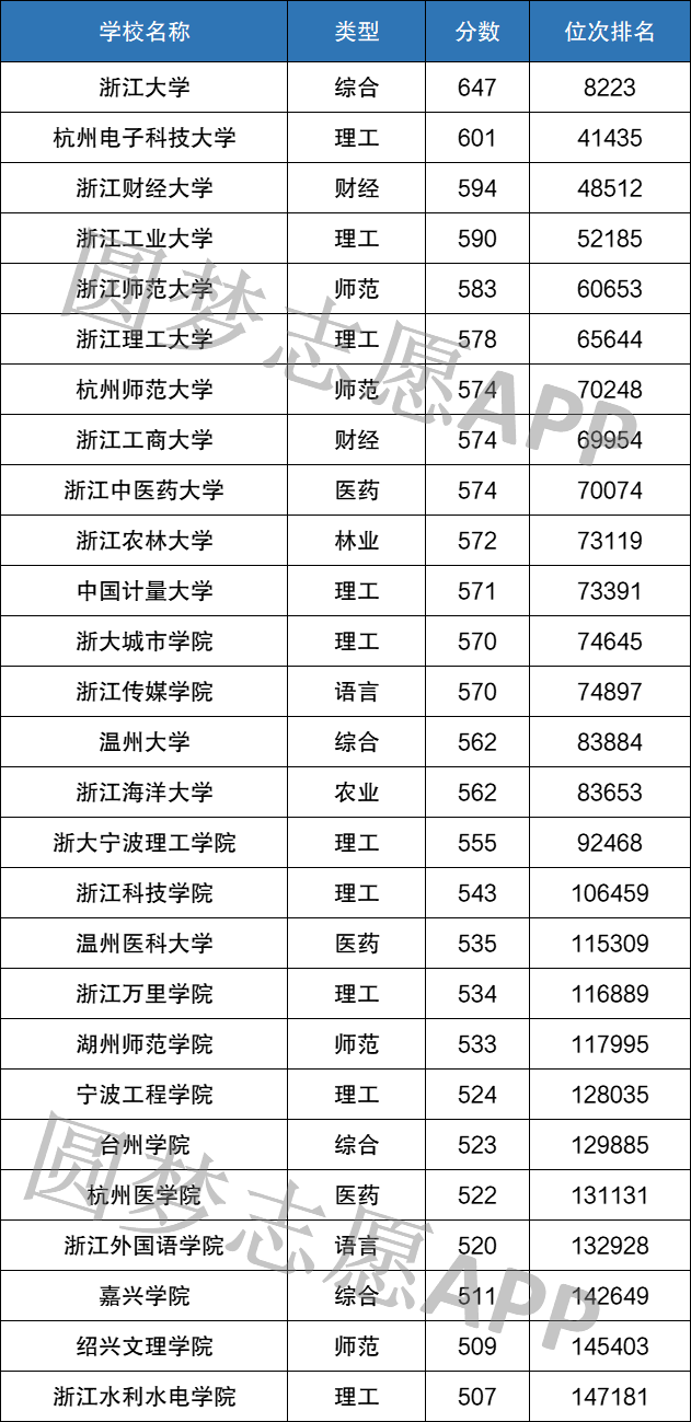 3、根据浙江省各高校在省内的录取分数线来看,其中收分最高的几所高校为浙江大学、杭州电子科技大学、浙江财经大学,前27所高校录取分数如下: