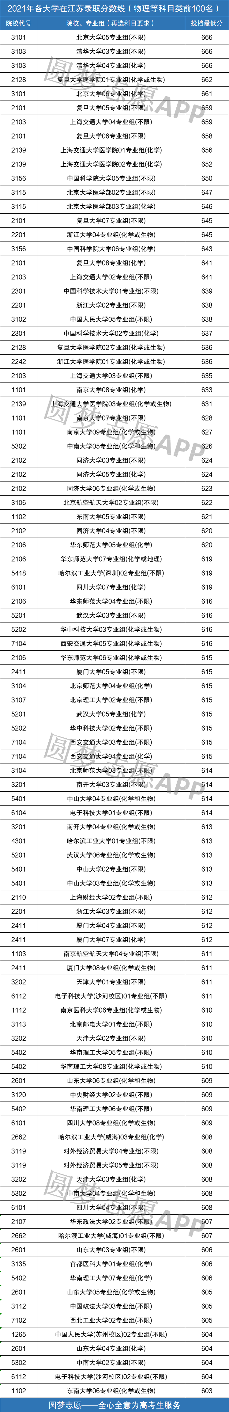 根据2021年江苏省教育考试院公布的"江苏省2021年普通高校招生普通类本科批次平行志愿投档线(物理等科目类)"中得知,2021年录取分数最高的大学分别是:北京大学和清华大学,录取分都为666分,由于江苏是第一年新高考,所以进入清华北大的录取分数相比其它省份要稍微低一些。