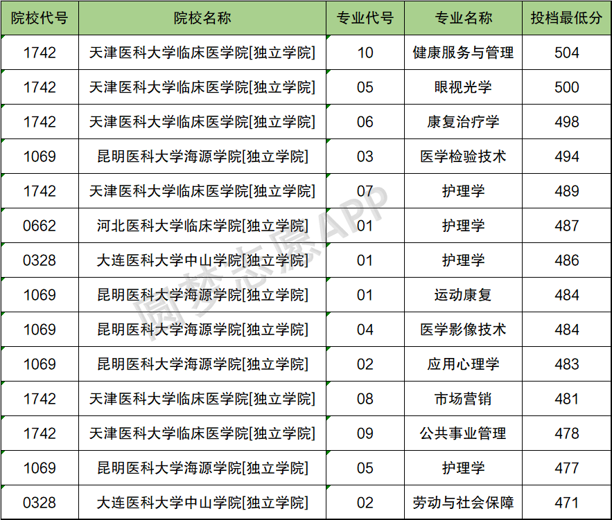 共计能报考多所独立学院中的14个专业,其中天津医科大学临床医学院的健康服务与管理专业,投档分为504分。