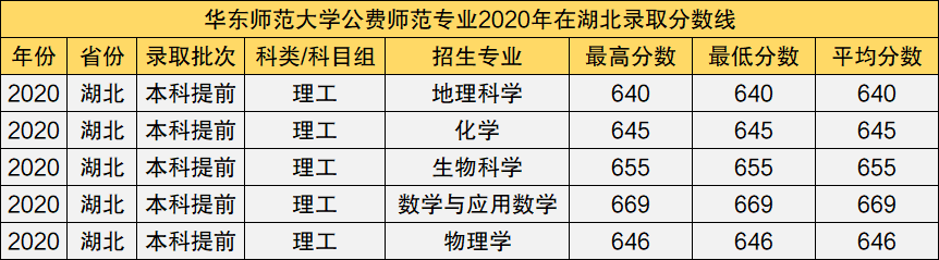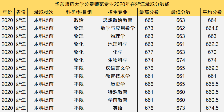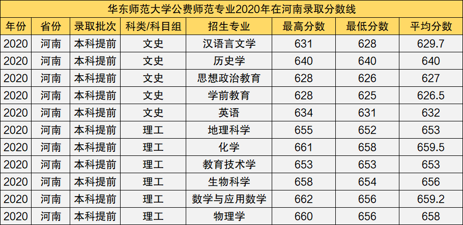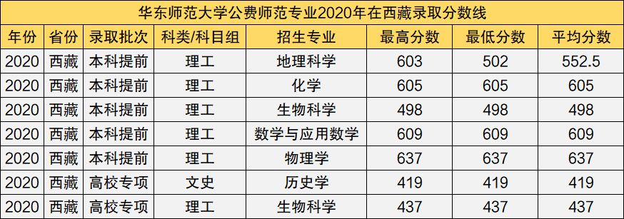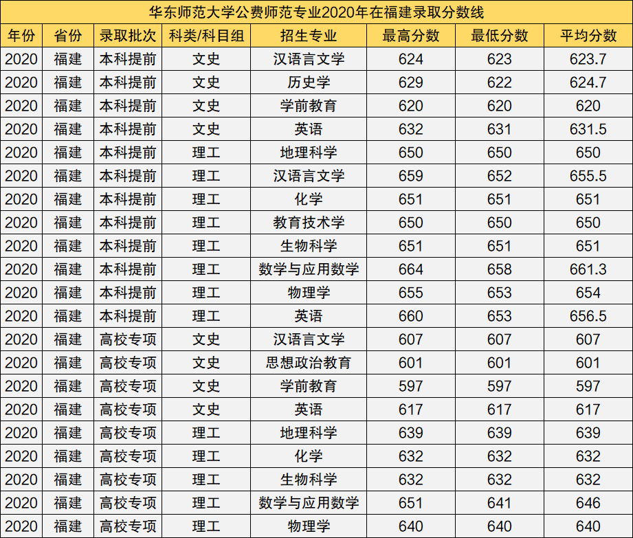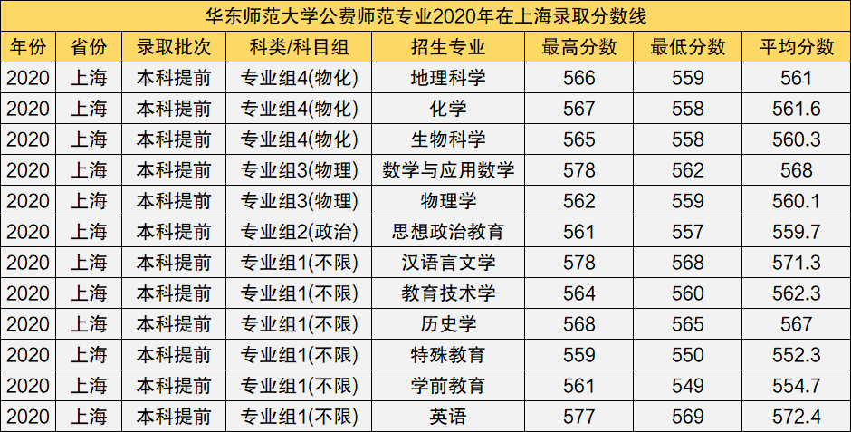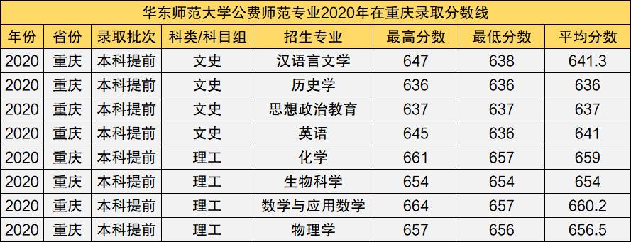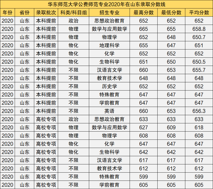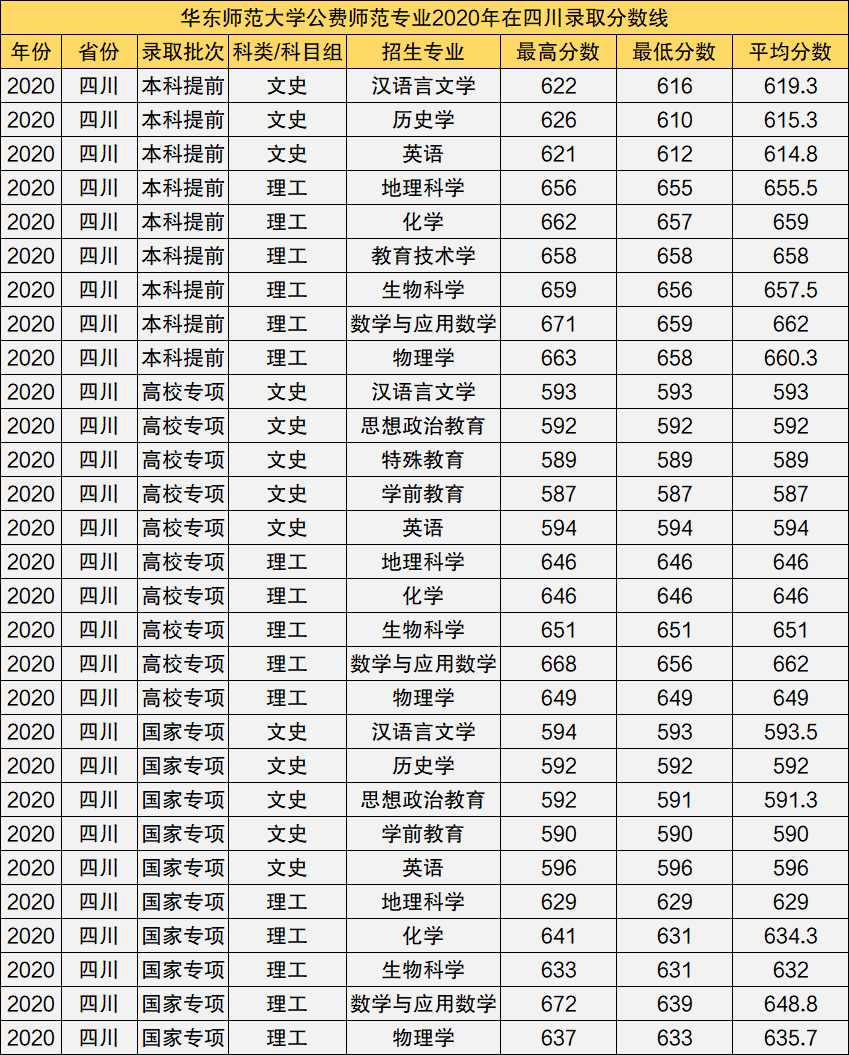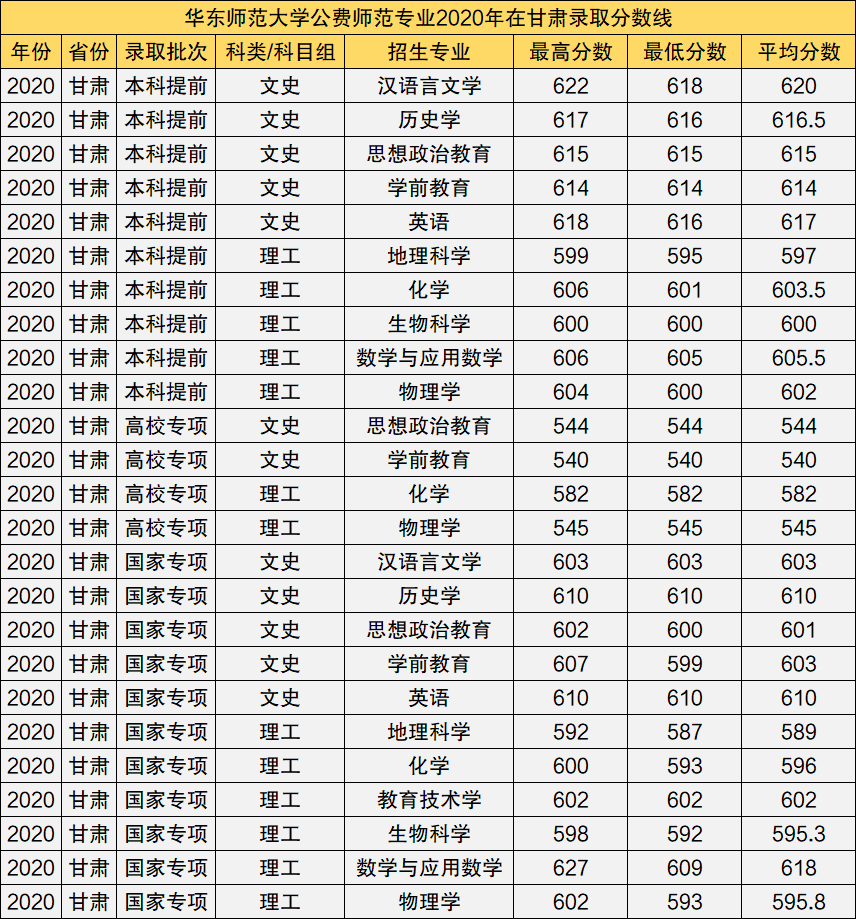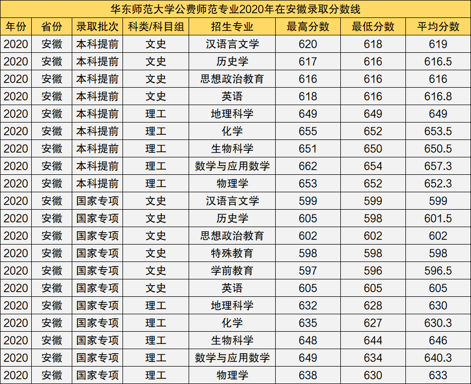 二、华东师范大学公费师范生2020年录取分数线:分省分专业汇总