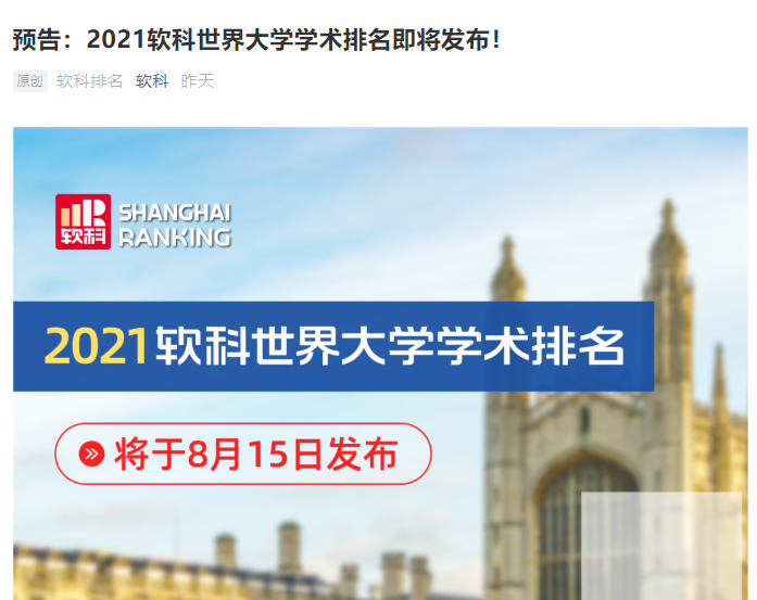 根据软科官方发布的消息可知,8月15日,2021软科世界大学学术排名(ShanghaiRanking's Academic-Ranking of World Universities,简称ARWU)将如期发布。各位也可以持续关注本文,一旦软科官方更新本文将在第一时间同步更新。