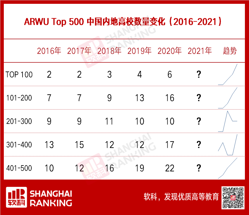 自2016年以来,中国内地高校便开始在ARWU百强中崭露头角,并呈现出逐年增加的态势,从起初的清北两家,到2020年已增长至6所。