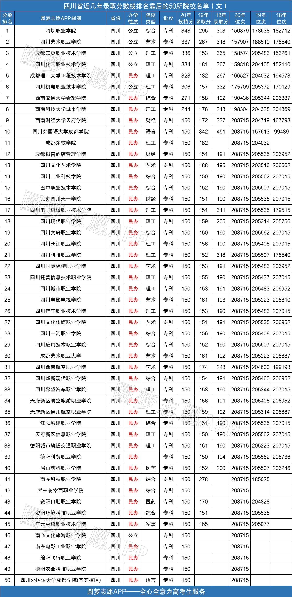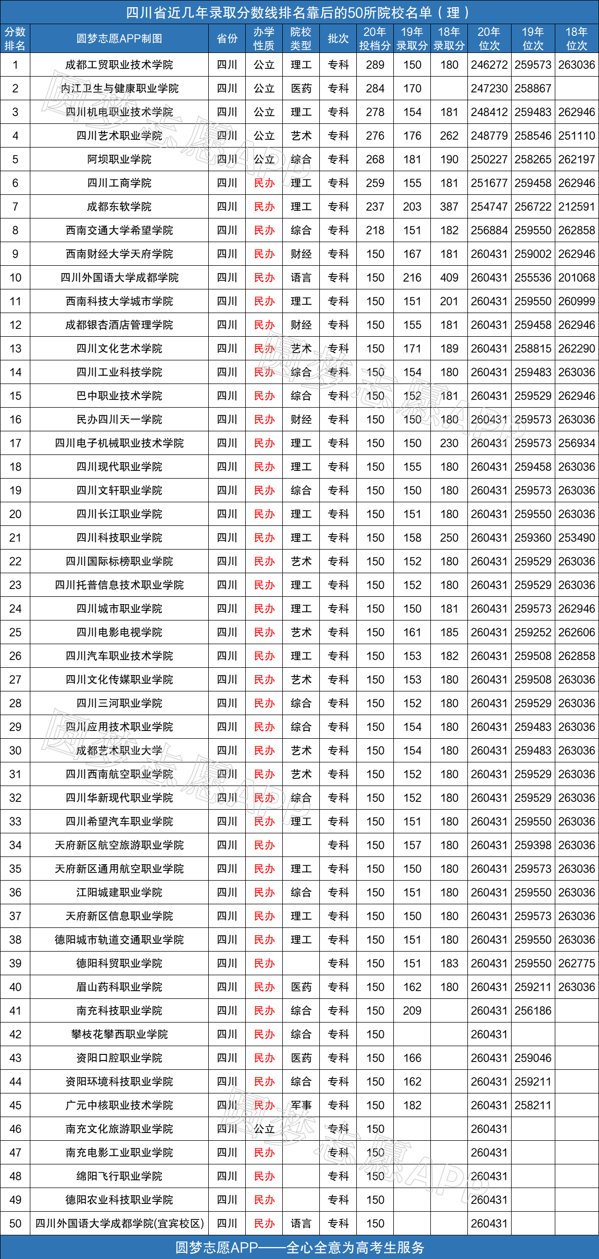 2021四川专科投档线暂未公布,待官网公布后,本文会第一时间为大家整理更新,各位考生请保持关注。以下是四川省近几年录取分数线排名靠后的50所专科学校名单,各位考生可参考。