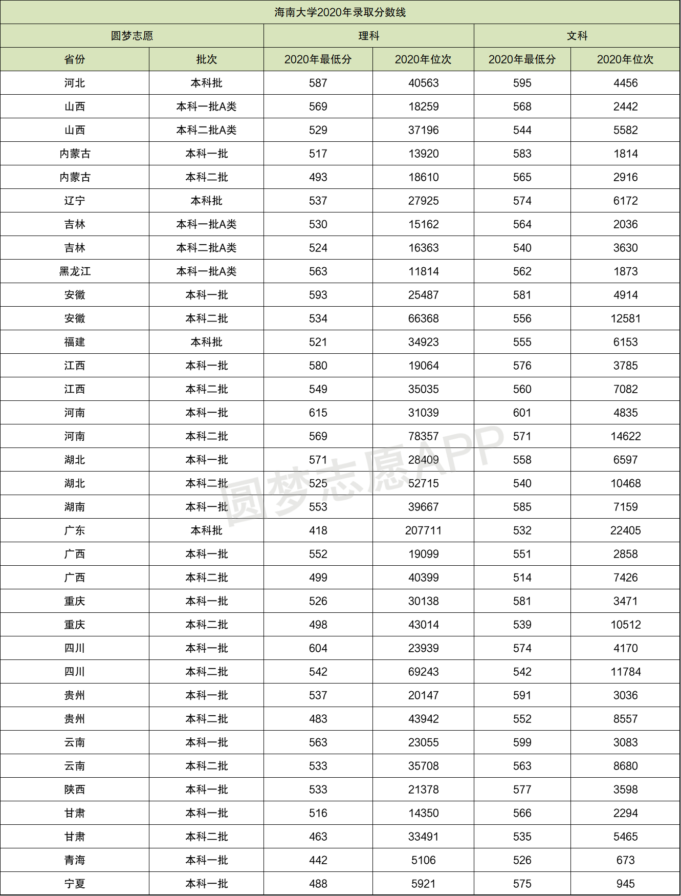 海南大学2020年录取分数线: