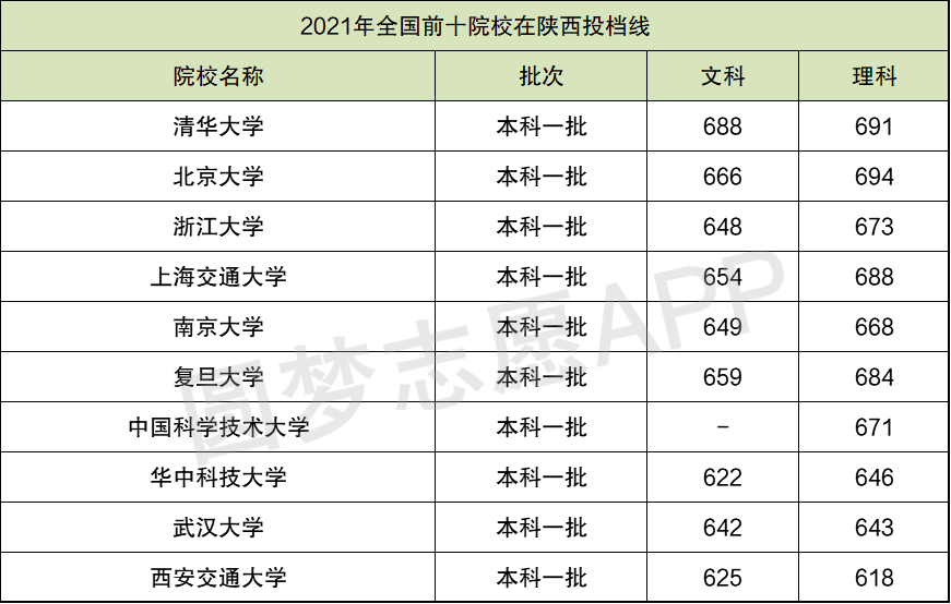 2021年前十院校中在陕西文科收分最高的是清华大学,2021年的投档线为688分,收分最低的是华中科技大学,2021年的投档线为622分;在四川理科收分最高的是北京大学,2021年的投档线为694分,收分最低的是西安交通大学,2021年的投档线为618分。