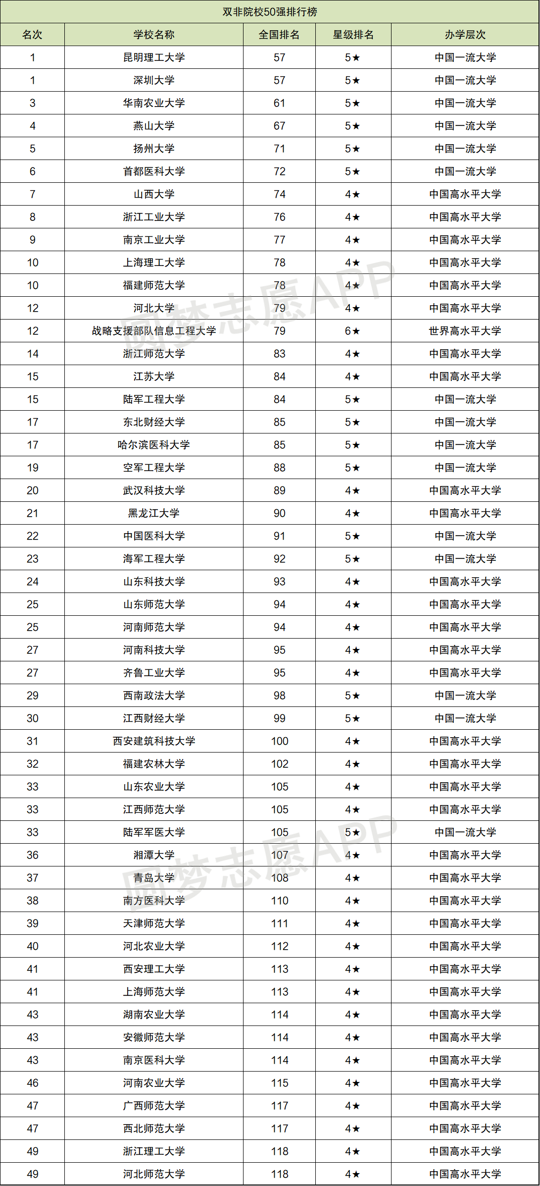 双非院校50强排行榜: