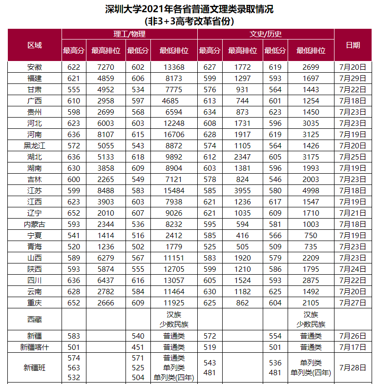 根据深圳大学官网公布了2021年各省普通文理类录取情况,我们可以得知深圳大学在全国非3+3高考改革省份的收分,大部分都是接近600分,或者是在600以上。尤其是在文科招生,大部分省份的考生都需要排在全省3000名以内才能考上,可见学校的招生门槛还是比较高的。