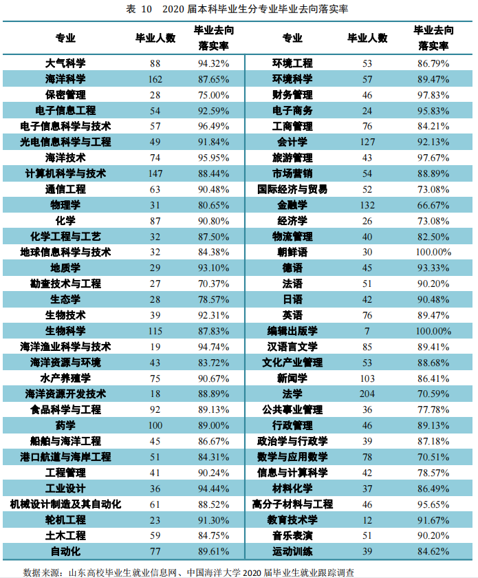 下面是2020届中国海洋大学本科毕业生分专业毕业就业率一览表: