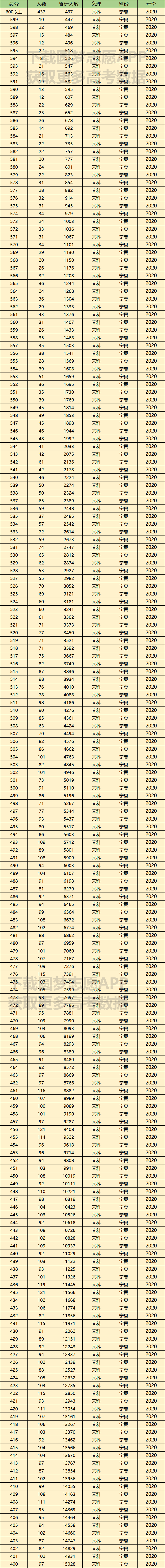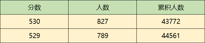 举个例子:下图为某省文科2019年的一分一段表,从表中我们可以看到,该省530分的考生一共有827人,530分即以上的累计人数为43772人,那么530分在该省2019年对应的最低位次为第43772名。