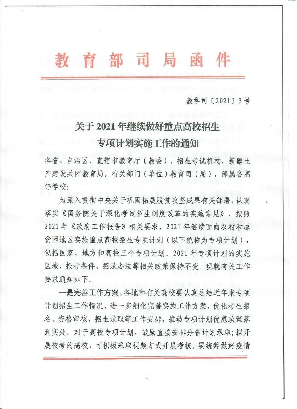 1.教育部关于2021年继续做好重点高校招生专项计划实施工作的通知