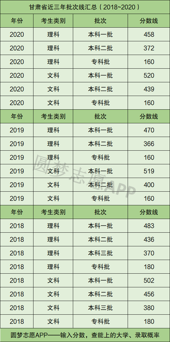 2020甘肃高考分数线理科一本,二本,专科分别为458分、372分、160分;