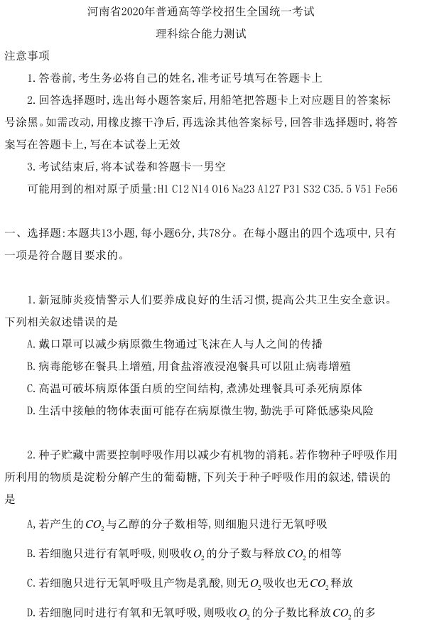 2020年的河北省还未加入新高考,所以2020年依旧是使用的全国一卷,而生物又属于理科综合,所以以下的2020年全国一卷理综试题包含了生物高考真题及答案解析。