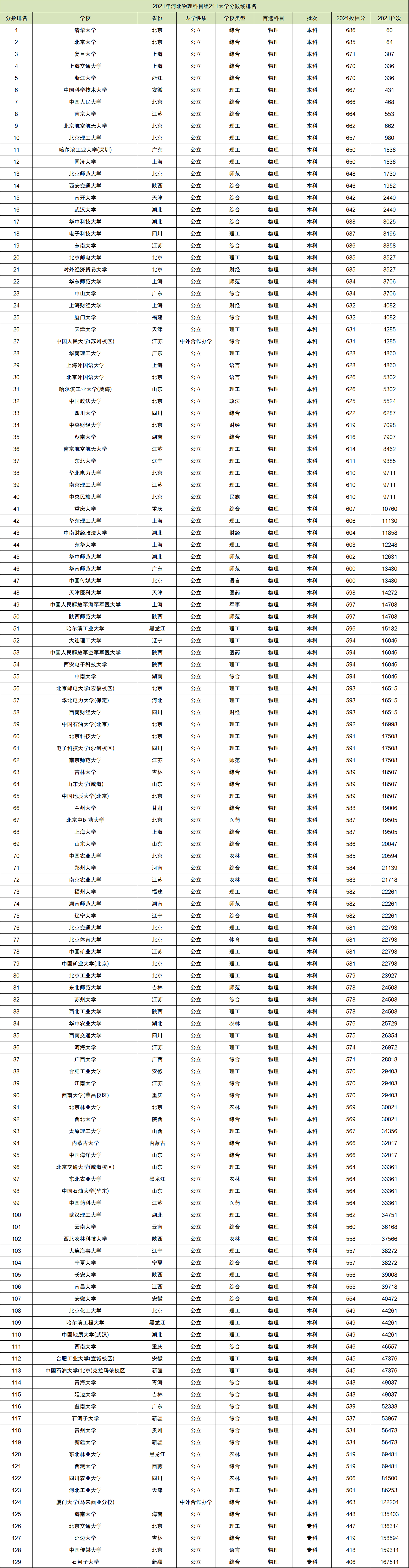 2021年在河北物理科目组收分最高的211大学也是清华大学,2021年的投档线为686分,位次为60位;收分最高的纯211院校是北京邮电大学,2021年的投档分是635分,位次为3527位。
