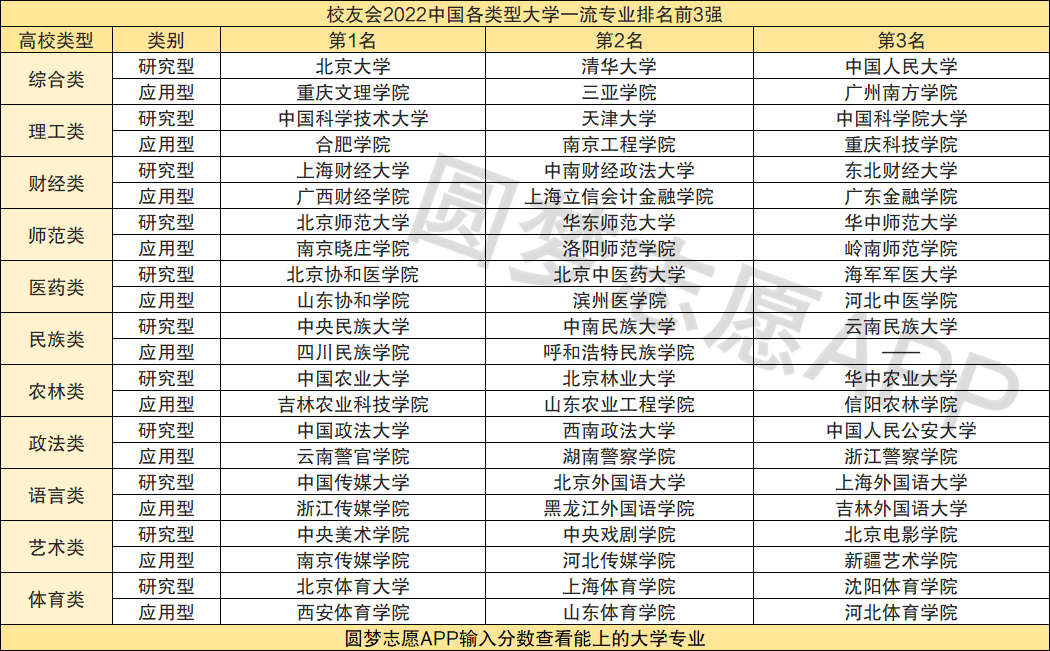 另外根据2022年校友会各类大学一流专业排名,本文也整理了一下全国各类大学中排名前三的高校名单。具体如下: