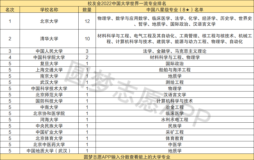 下面是校友会2022年中国八星级专业(世界一流专业、中国顶尖专业)的排名情况: