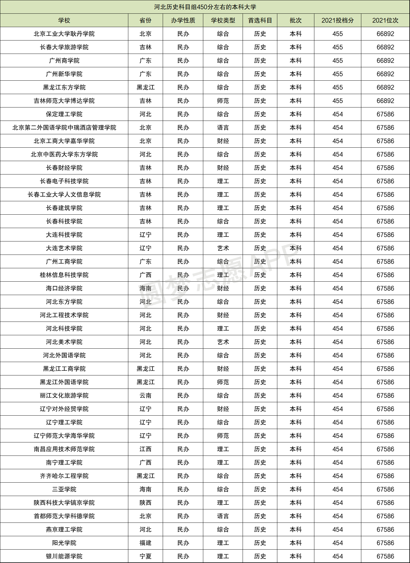 2021年河北历史科目组的本科批次线为454分,也就是说,450分左右的考生是有上本科院校的可能的,2021年在河北历史科目组450分左右本科院校一共有40所,均为民办院校,所以说在这个分数段内,考生就算能够上本科,也只能上民办院校,对于家庭条件不太好的考生来说,小编更建议选择公办专科院校。