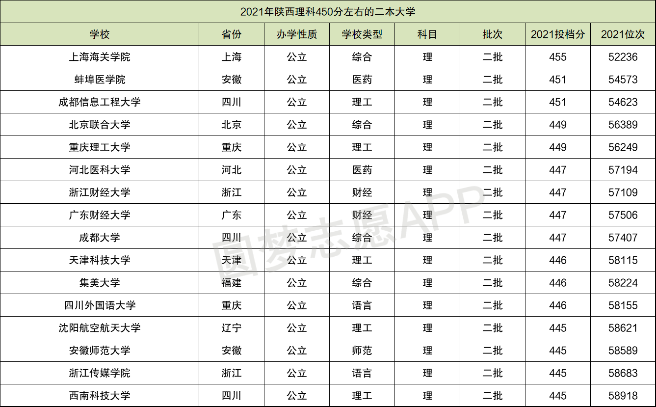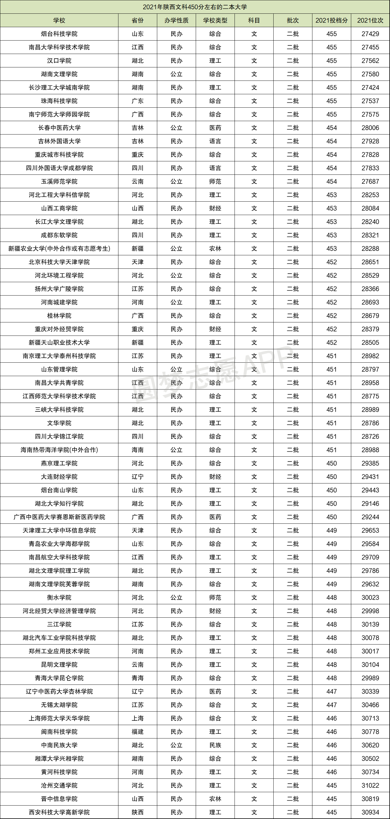 小编就以陕西为例,根据山西教育考试院公布的2021年招录数据,为大家整理出陕西450分左右的二本大学。