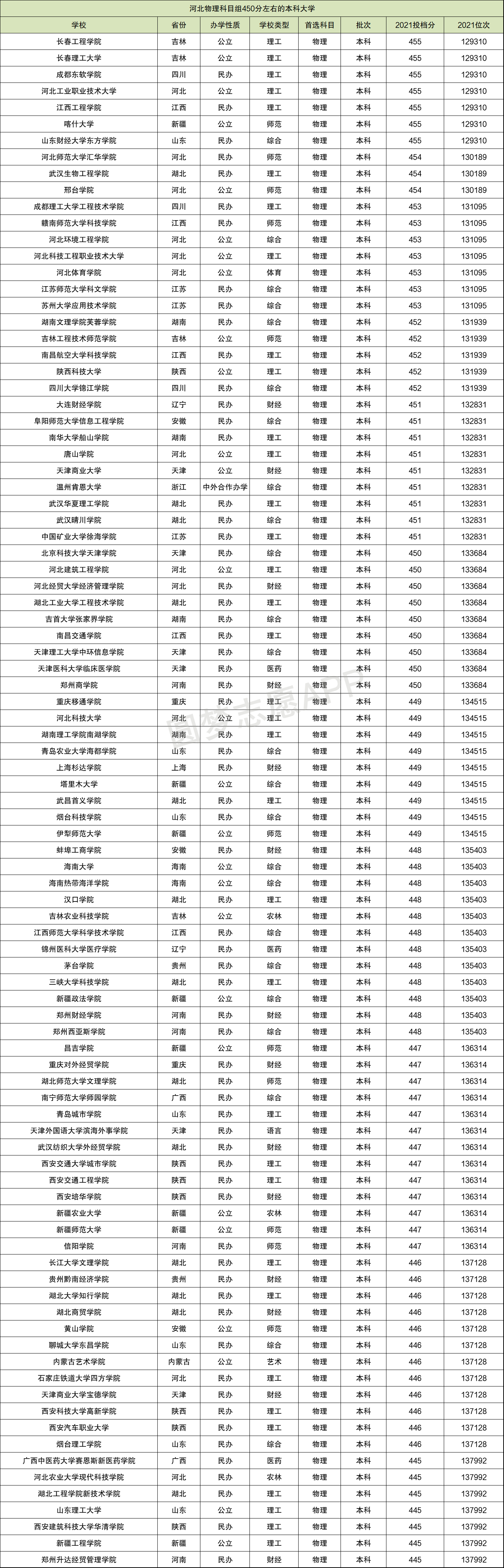 2021年河北物理科目组的本科批次线为412分,所以450分左右是肯定能上本科院校的,2021在河北物理科目组450分左右的本科院校一共有93所,但是在本科院校中公办院校数量较少,只有27所,剩余的本科院校中有65所民办院校、1所中外合办院校。所以对于想报公办大学的同学来说,竞争是非常激烈的。