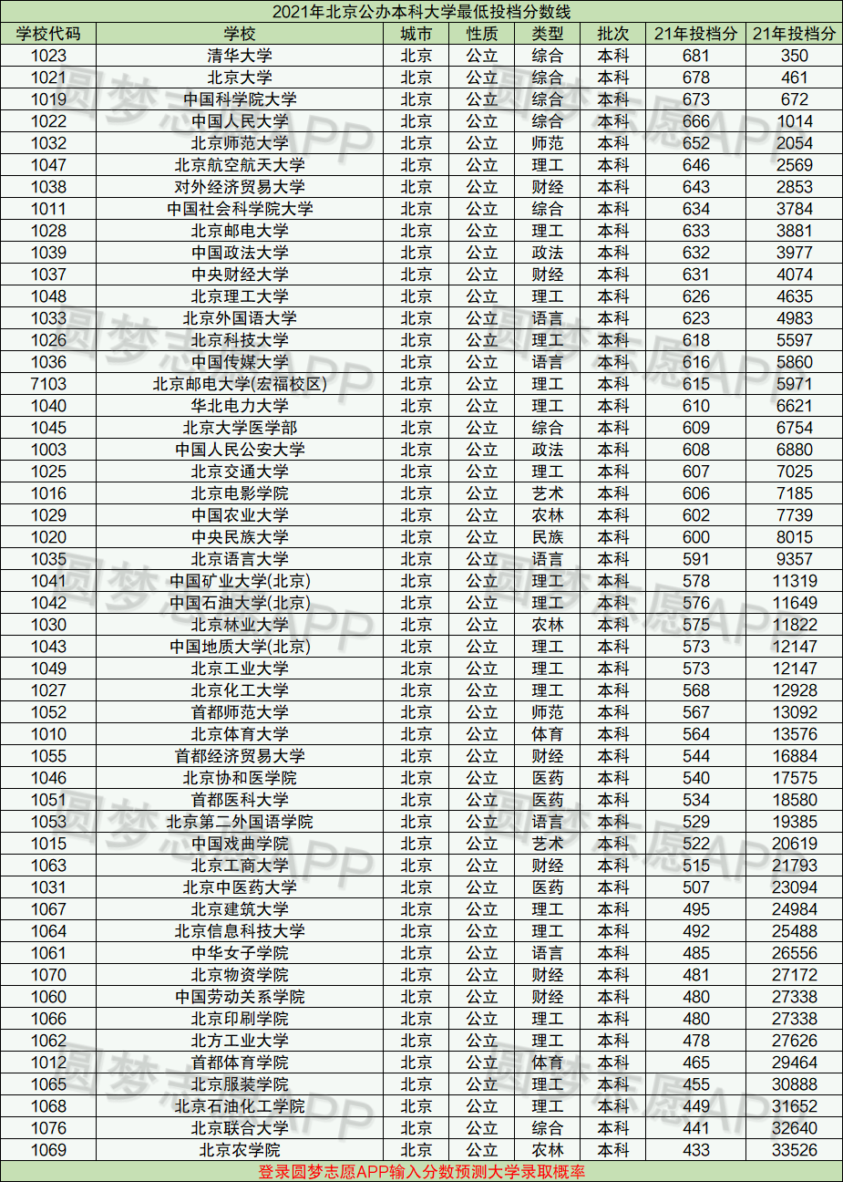 小编整理了一下2021年北京市公办本科大学在当地的最低投档分数线,供大家参考,其他省份的分数线情况大家可以在中查看。