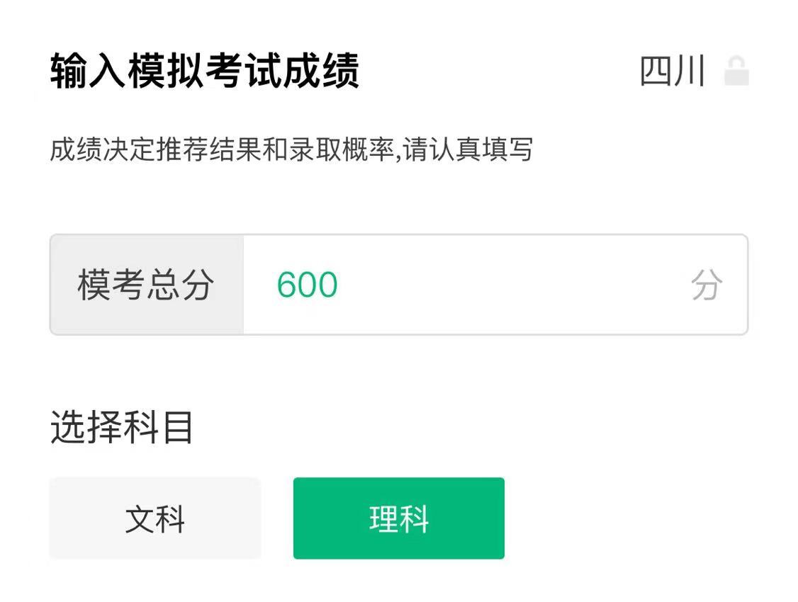 第一步:输入自己的模考分数、选择科类、以及生源地(以四川省600分理科为例)
