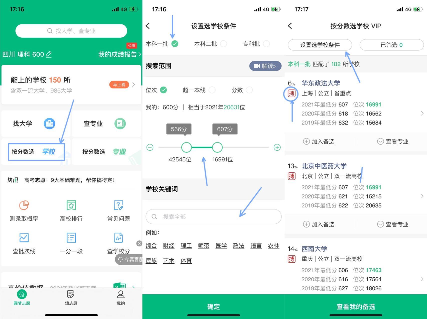 第二步:如图,点击按分数选学校或按分数选专业,设置分数或位次区间,即可分别看到推荐院校推荐专业,以及智能评估出的录取概率。