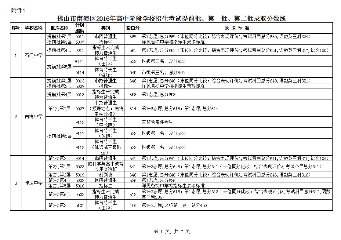 附件:1.佛山市南海区2016年高中阶段学校招生考试提前批、