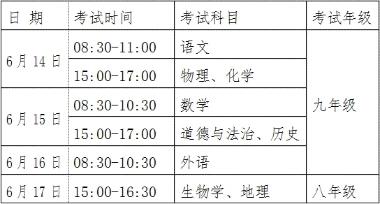 池州市教体局近日发布通知,我市2022年初中学业水平考试将于6月14日进行,考试内容包括文化课、体育健康、实验操作。九年级语文、数学、外语、道德与法治和历史、物理和化学,八年级生物学、地理,由全省统一命题、统一制卷。