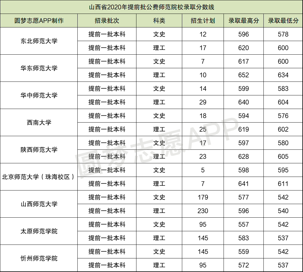 由于每所院校在每个省份的录取分数都不一样,小编就以山西省为例,根据山西省教育考试院公布的2020年提前批录取数据,为大家整理出了2020年在山西招生的公费师范生院校的录取分数线,供2021年考生参考。