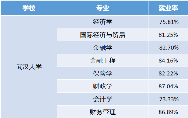 武汉大学是一所综合类高校,财经类各专业的就业率要稍低于上海财经大学,其中,会计学的就业率最低,为73.3%,其他专业的就业率基本都在83%左右。在疫情期间,就业率能达到83%,说明这一专业的大部分学生都找到了工作。