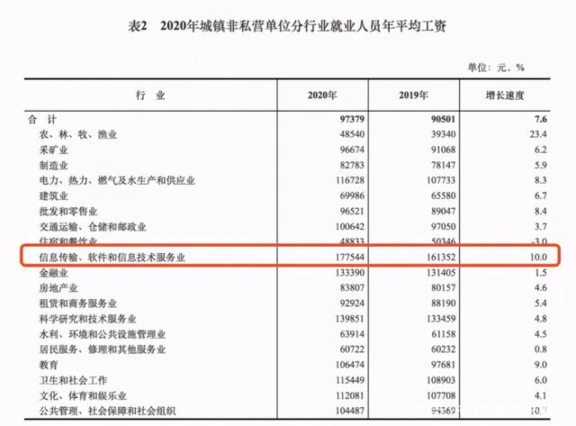 从这份专业收入排名来看,大部分专业都是与计算机有关,如收入进入前十的信息安全、软件工程、网络工程、物联网工程、计算机科学与技术和数字媒体技术等。同时,根据国家统计局发布2020年平均工资数据来看,信息传输、软件和信息技术服务业从业人员,2020年的年薪平均达到了177544元。如果大家比较看重薪资的话,报考这些专业准没错,但前提是自己得喜欢才行。