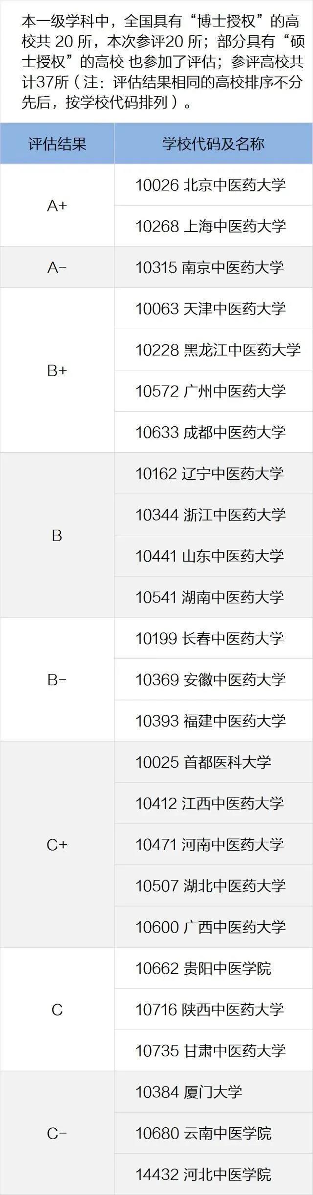 全国第四轮中医学学学科评估结果如下: