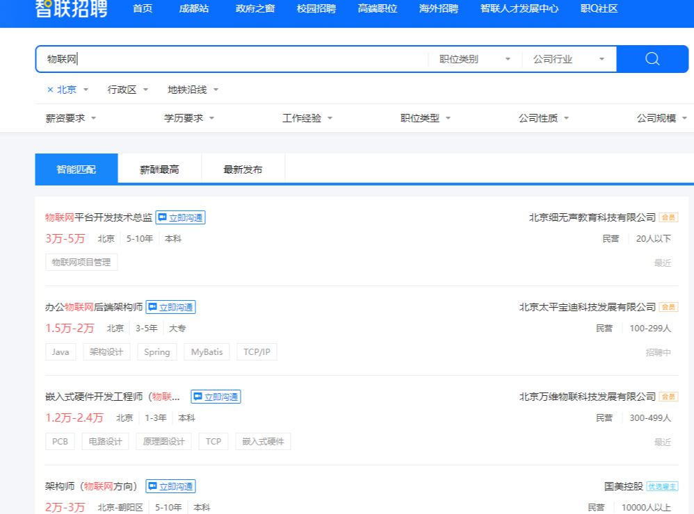 在智联招聘上查询物联网相关岗位薪资水平可以看到,有1-3年工作经验的起薪能达到1万,3-5年经验的薪资可以达到2-3万,工作经验时间越长,工资越高。所以,物联网专业毕业不但前景广阔,“钱”景也是不错的哦。