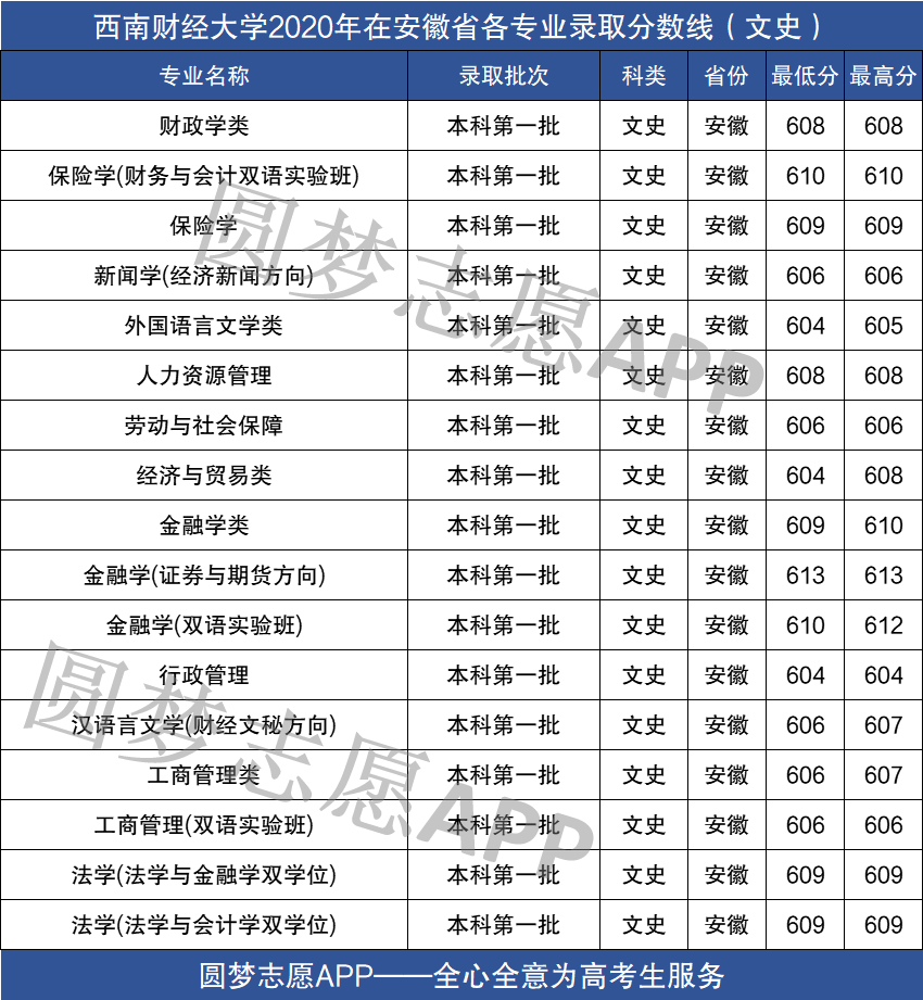 注:本文由于篇幅有限,仅展现了西南财经大学在四川、广东、安徽等省份的录取分数线,如需其他省份的资料,请下载圆梦志愿APP,一键获取。