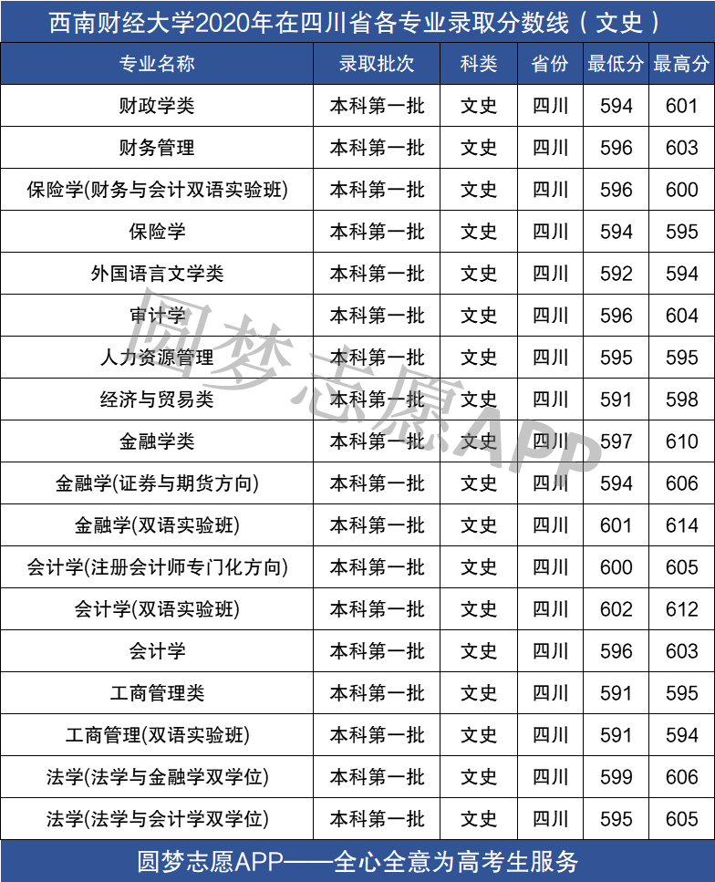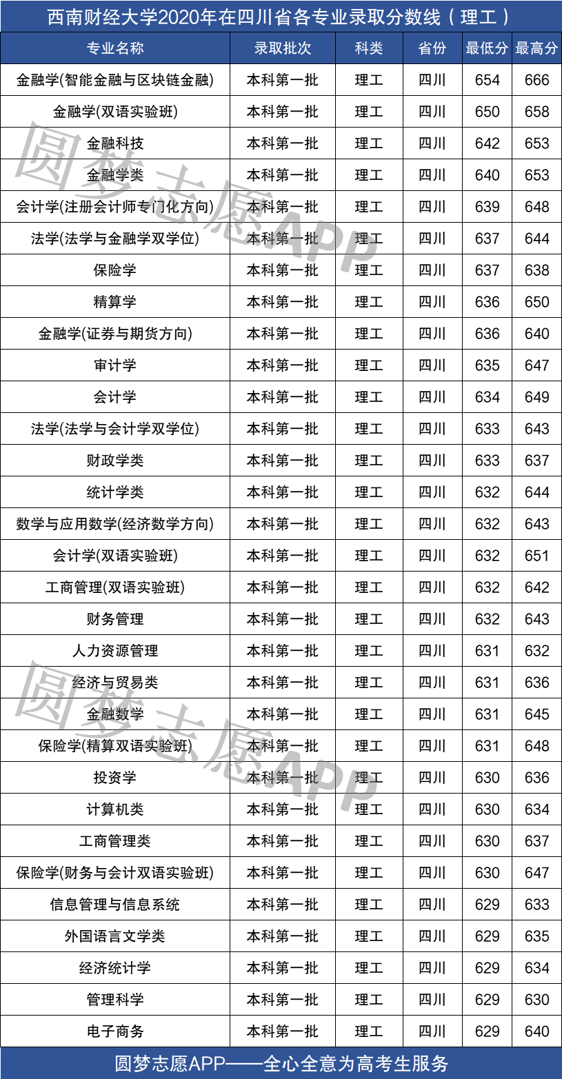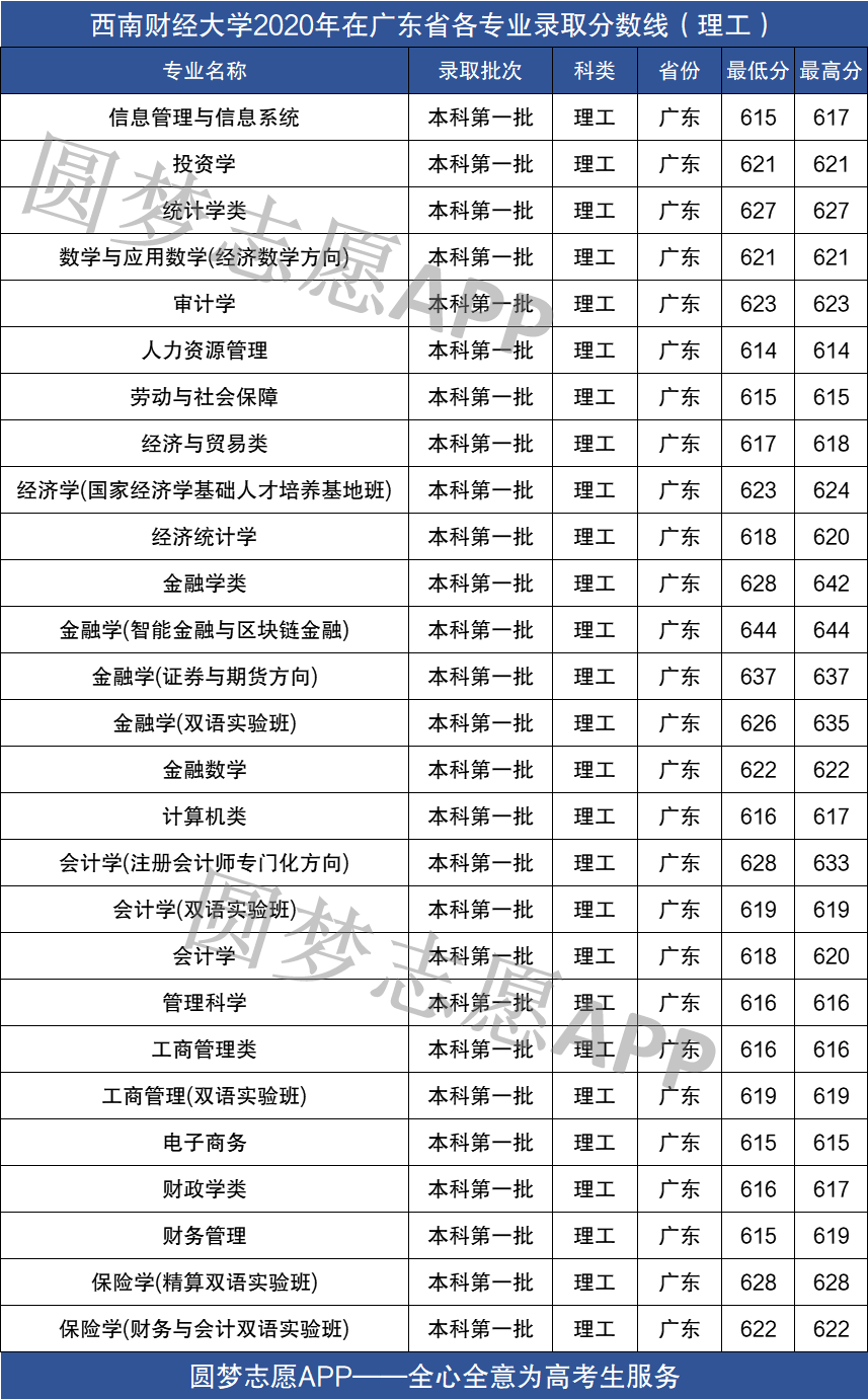 由于西南财经大学2021年的录取分数线要等到2021年的高考完全结束后才会公布,所以小编整理了2020年的数据供大家参考: