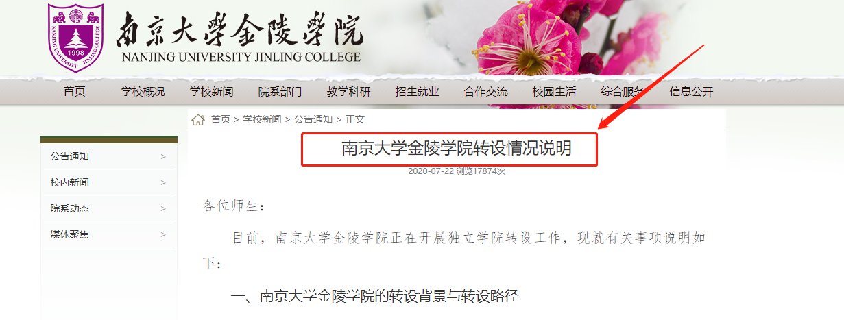 2020年7月,南京大学金陵学院发布“南京大学金陵学院转设情况说明”。该通知称,学校会并入南京大学苏州校区,有计划,分步骤完成转设。2020年9月学校会停止招生;2022年7月,金陵学院会迁址苏州办学;2023年7月,金陵学院2019届毕业生毕业之后,学校也完成了转设,即成为南京大学的一部分,不再有独立的办学资质。